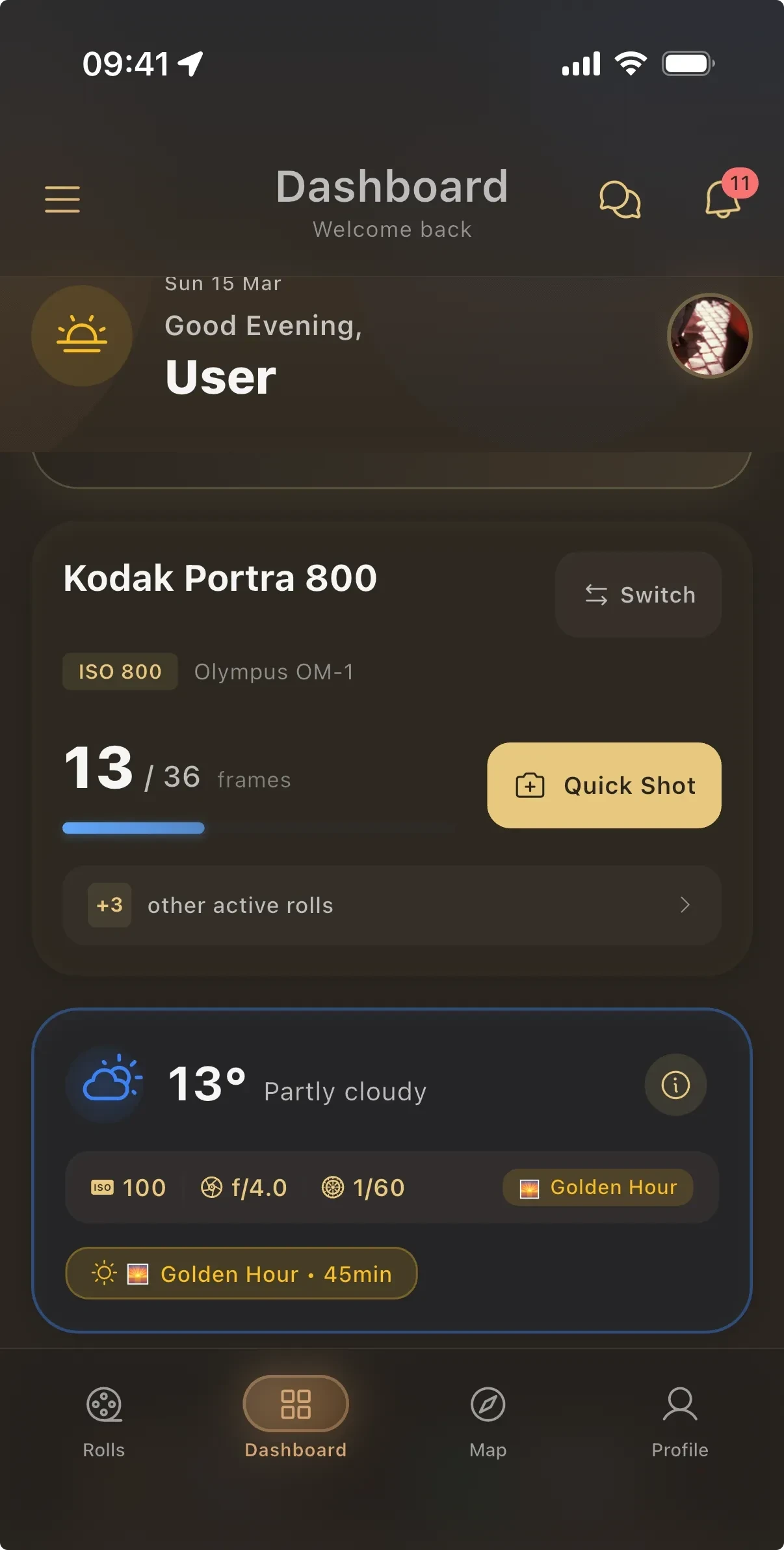 - Film roll management — Create, track, and organize all your rolls in one place. Support for 35mm, 120, and large format.